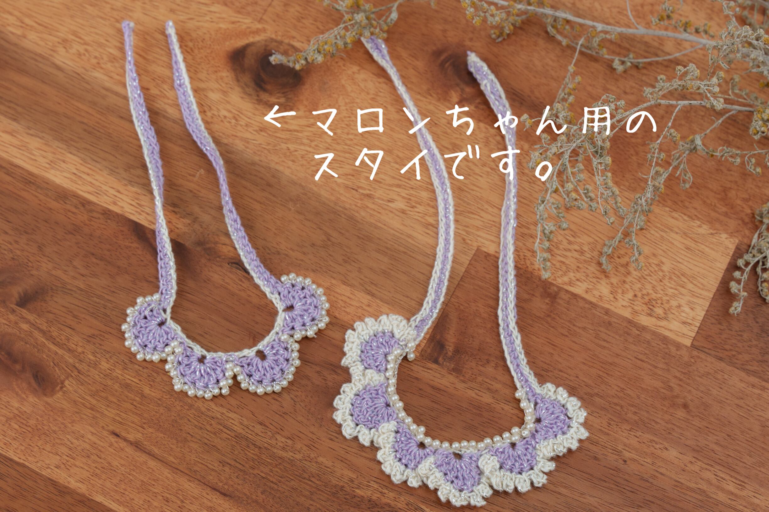 胸元にはレース模様とビーズで可愛らしく編んだスタイをつけています。スタイは前後逆につけても。