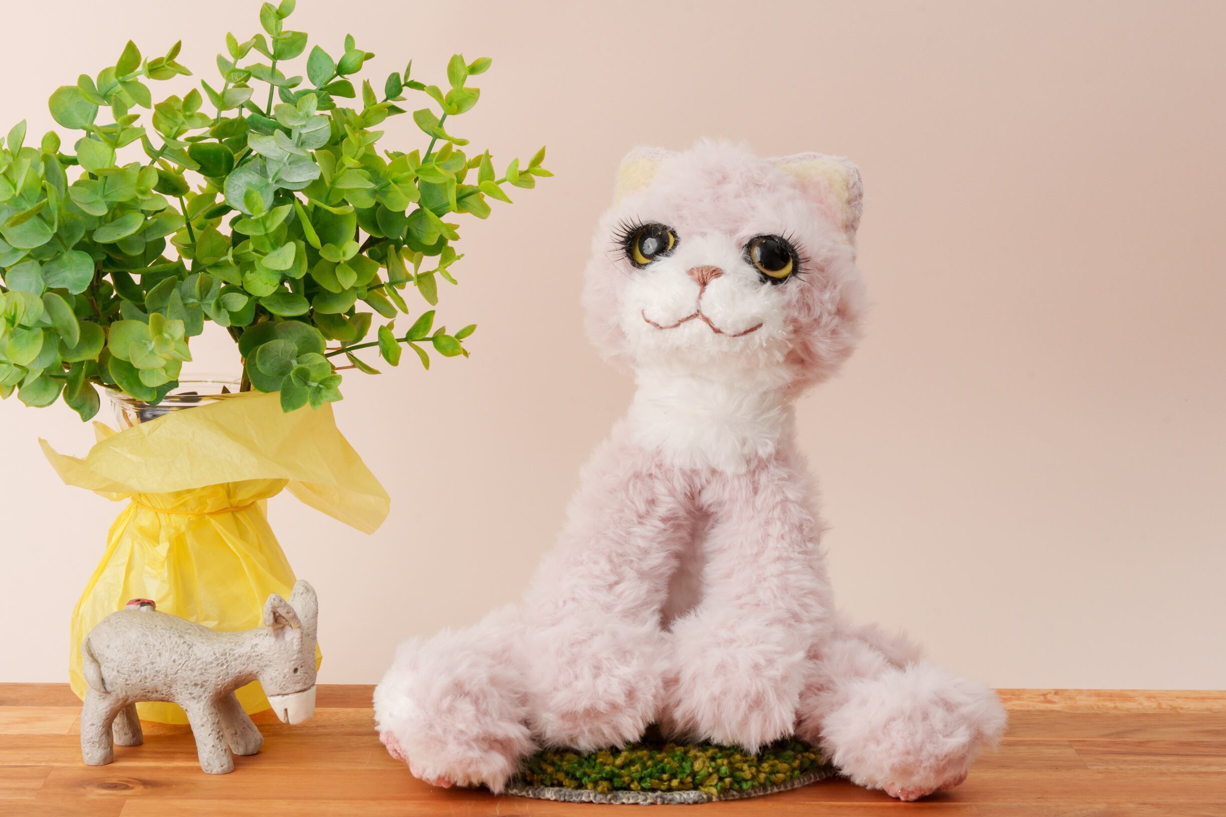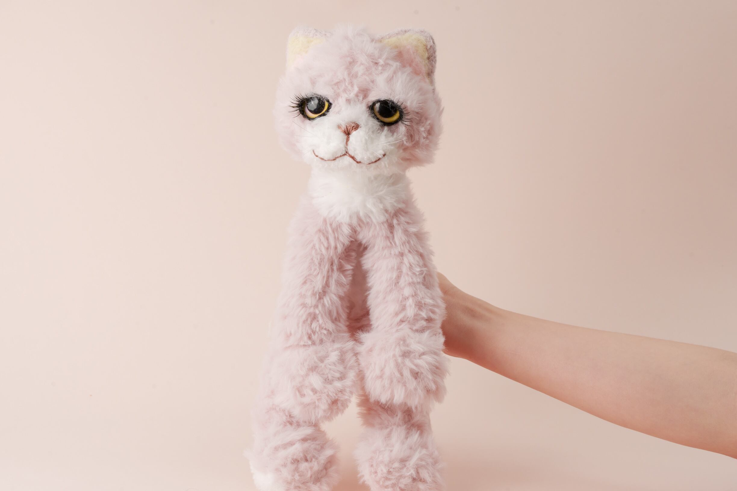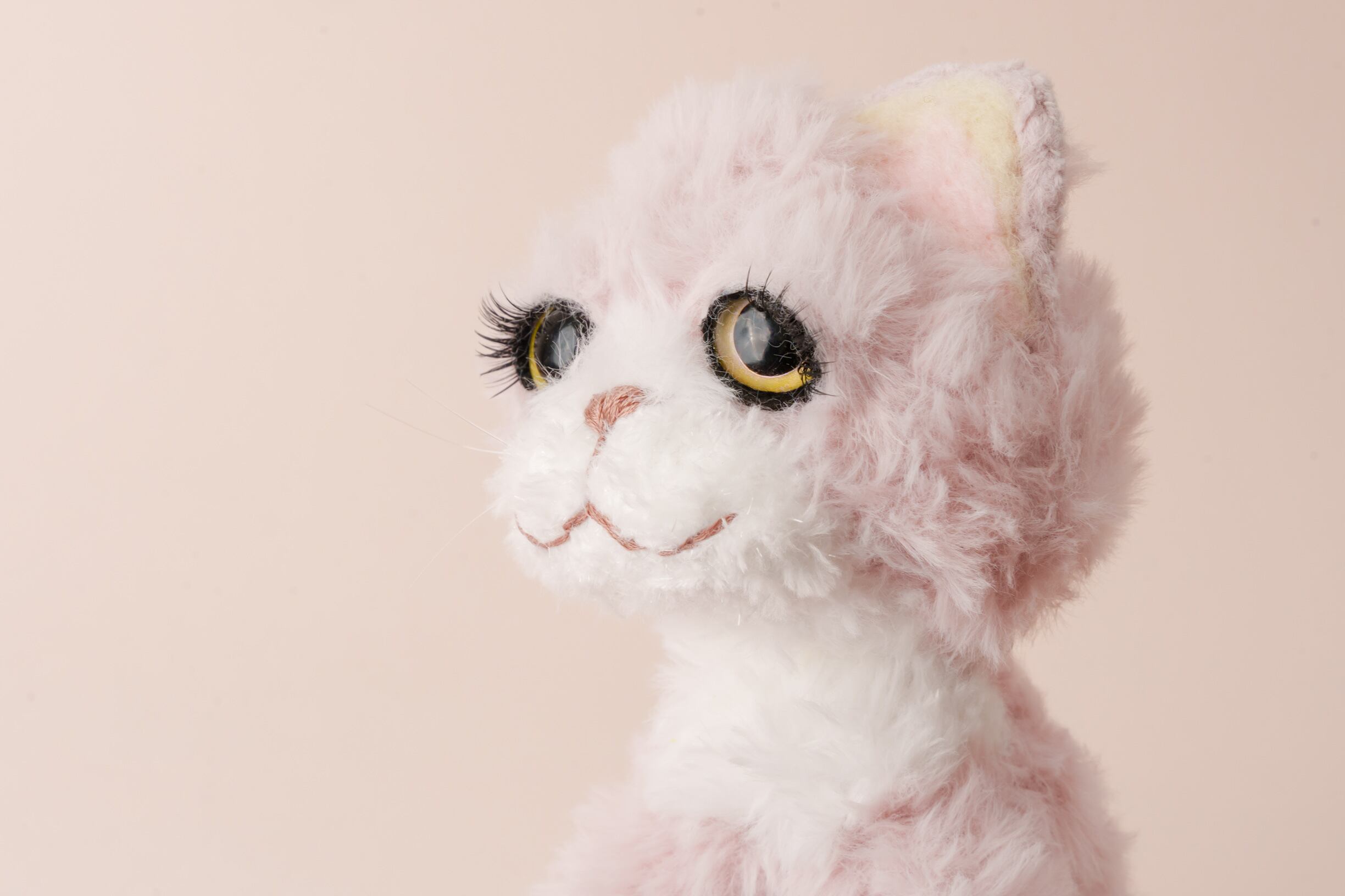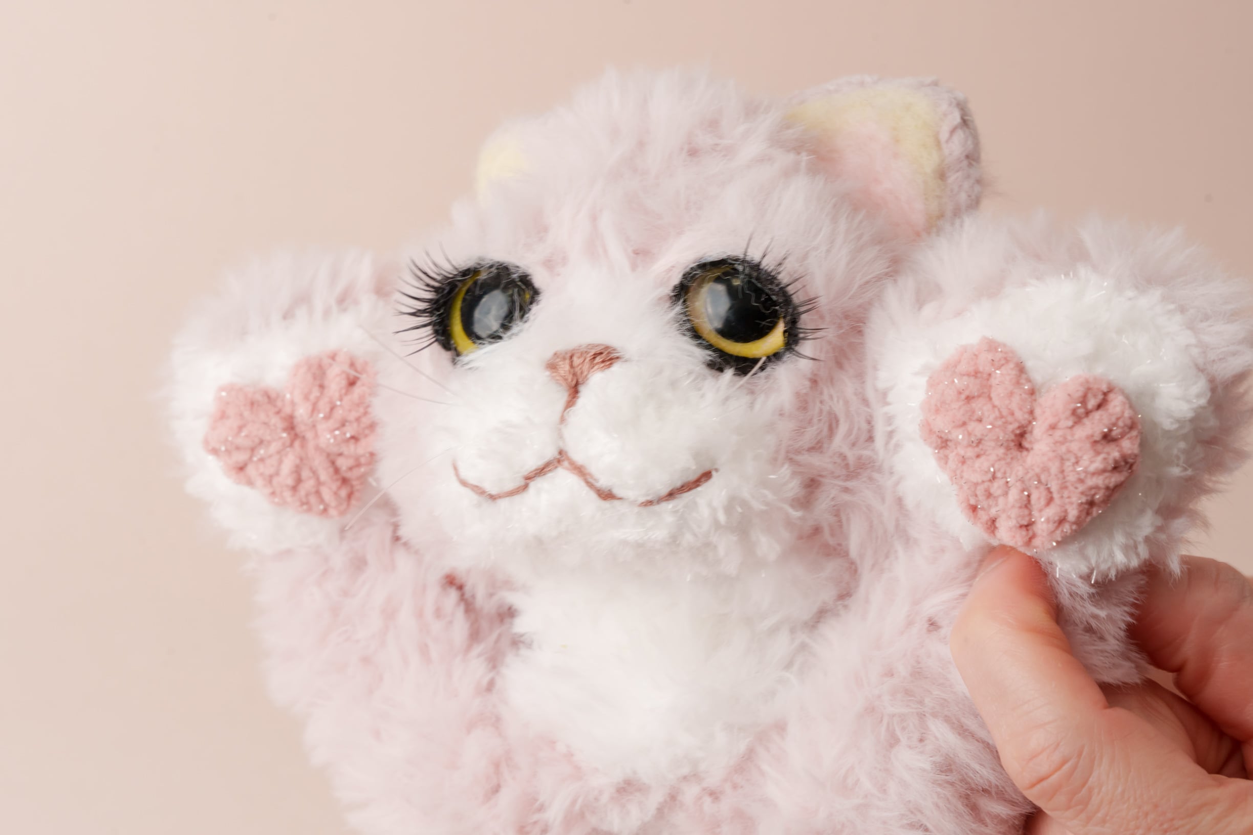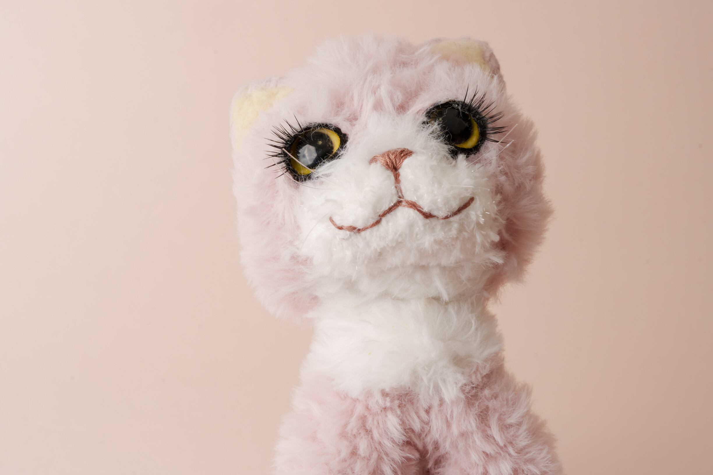 綿あめを思わせるパステルピンクの毛並みをまといパッチリとした長いまつ毛に縁取られた淡いスモークグリーンの瞳は、角度によってピンク色の浮かぶ不思議な色合いに色付けしました。