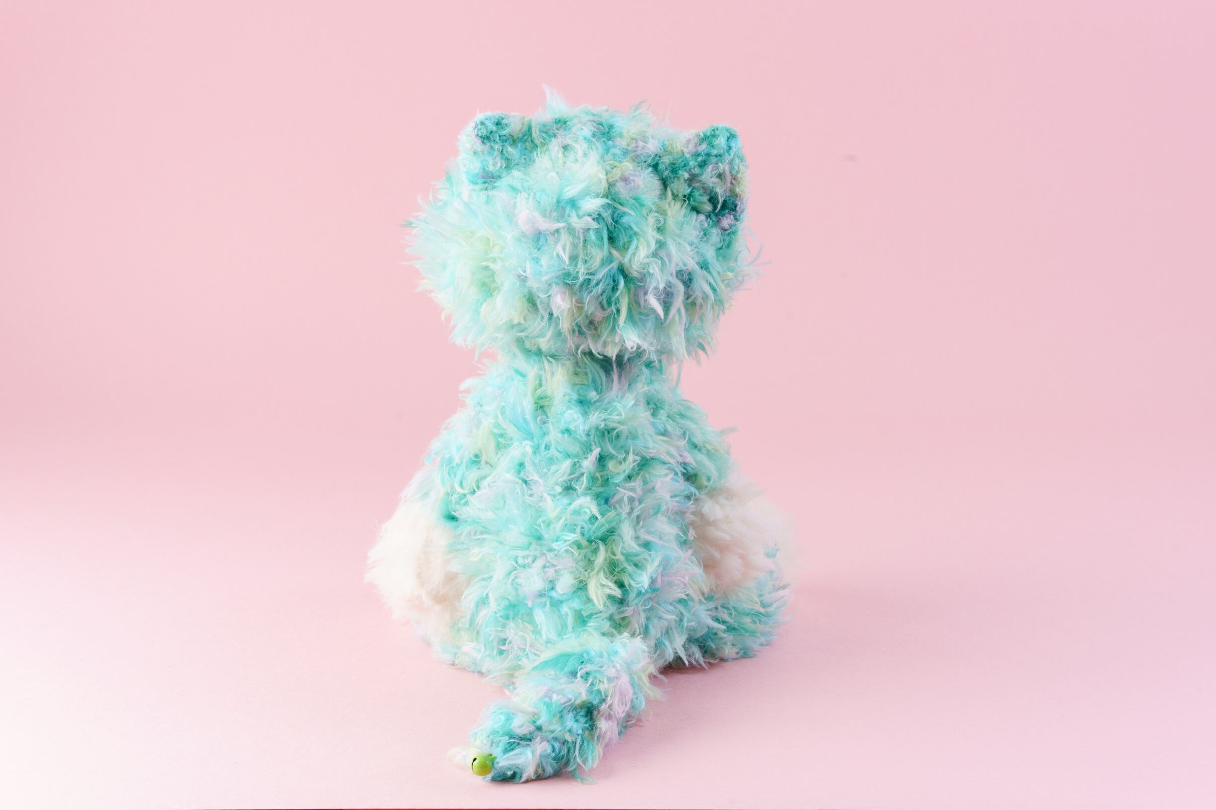 とても柔らかで繊細なファーヤーンを使い手編みで編み上げた猫のあみぐるのアクア。