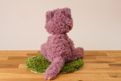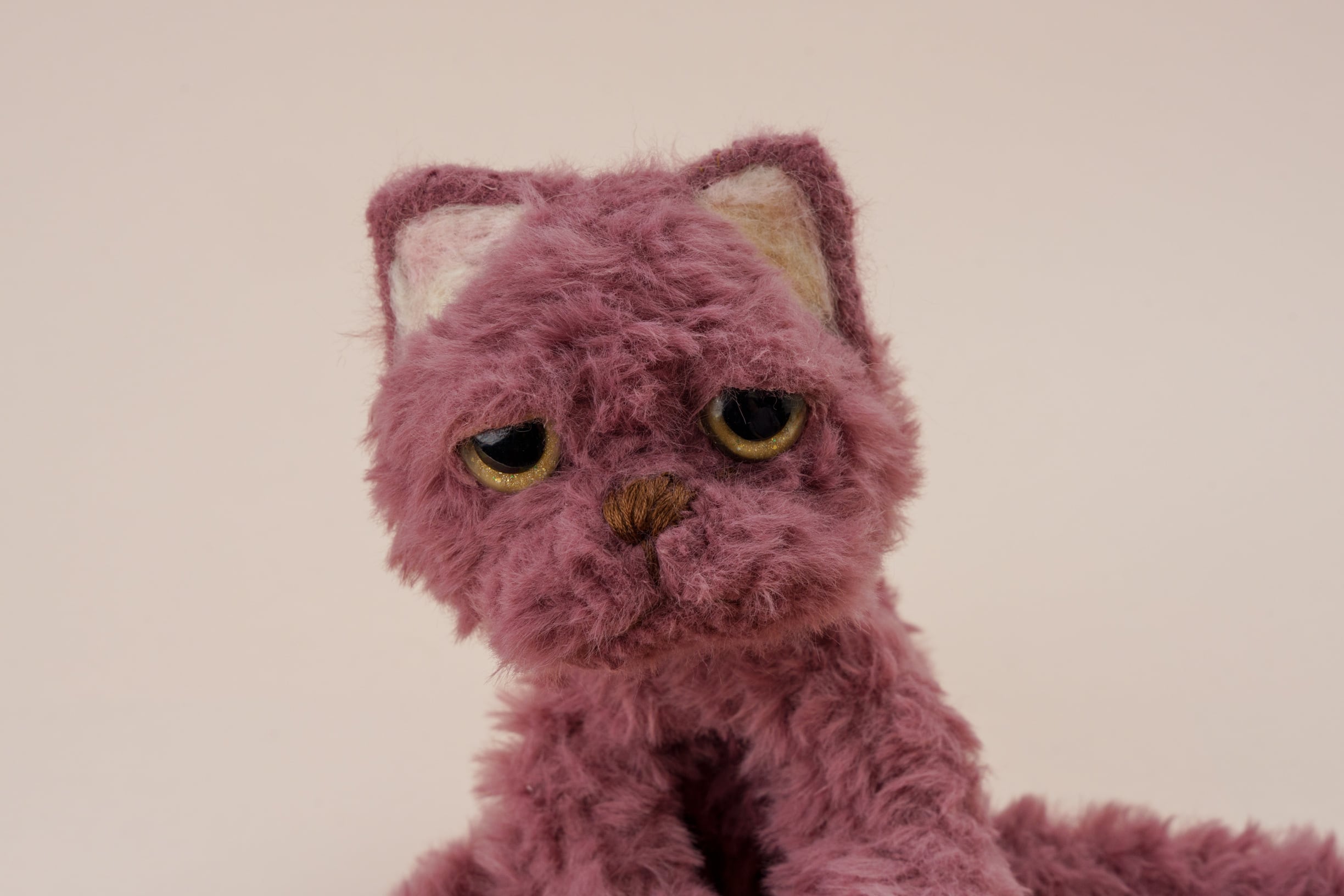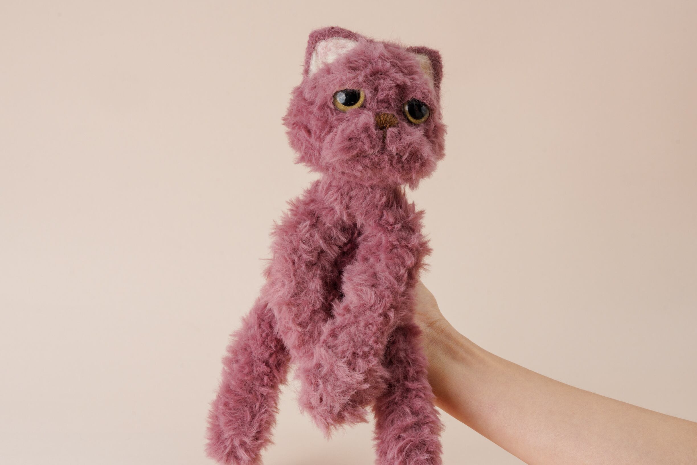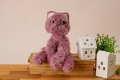 バッグにスッポリ収まる小さめsmallサイズの手編みのネコのあみぐるみです。スモーキーピンクのエコファーで小さな子猫ねこを編み上げました。