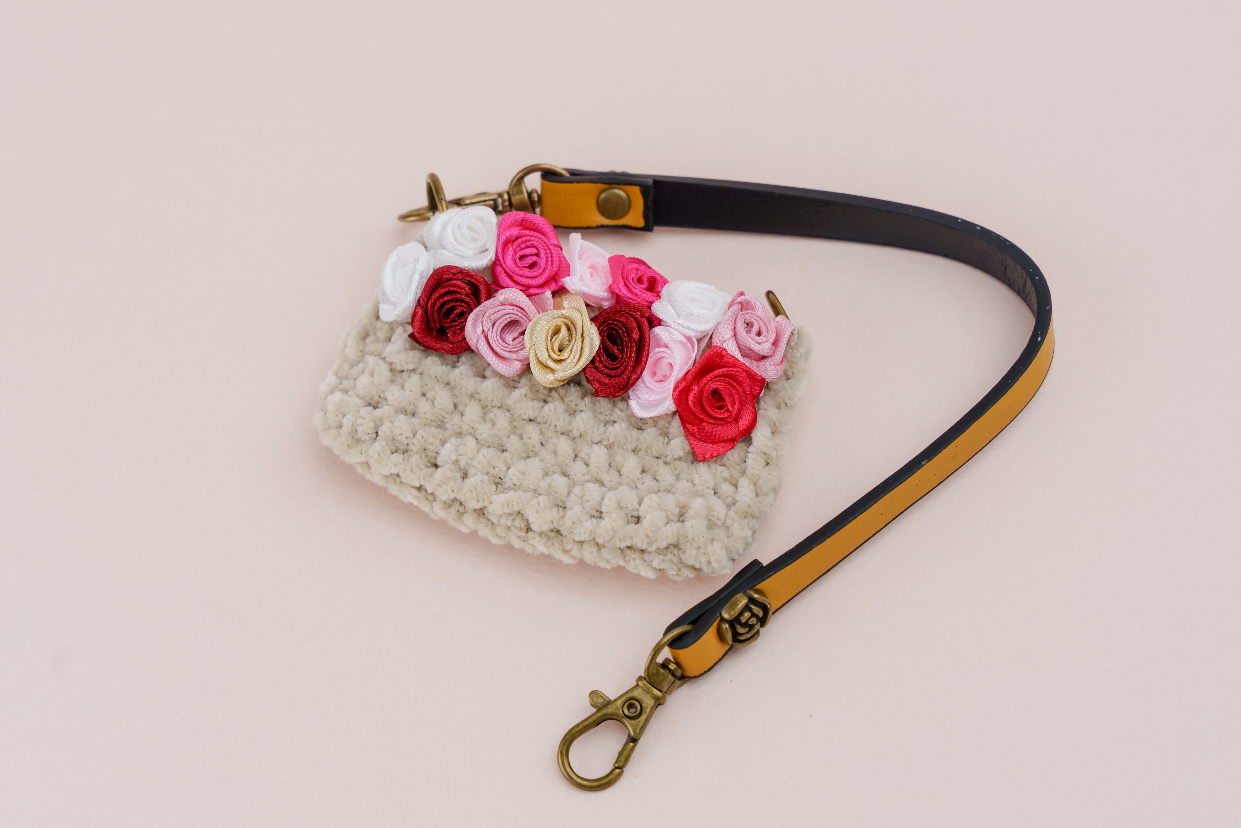 バラのお花がたくさん付いたバッグを持ってフクフクな肉球でどこまでも散歩に行きたいパヤ子。