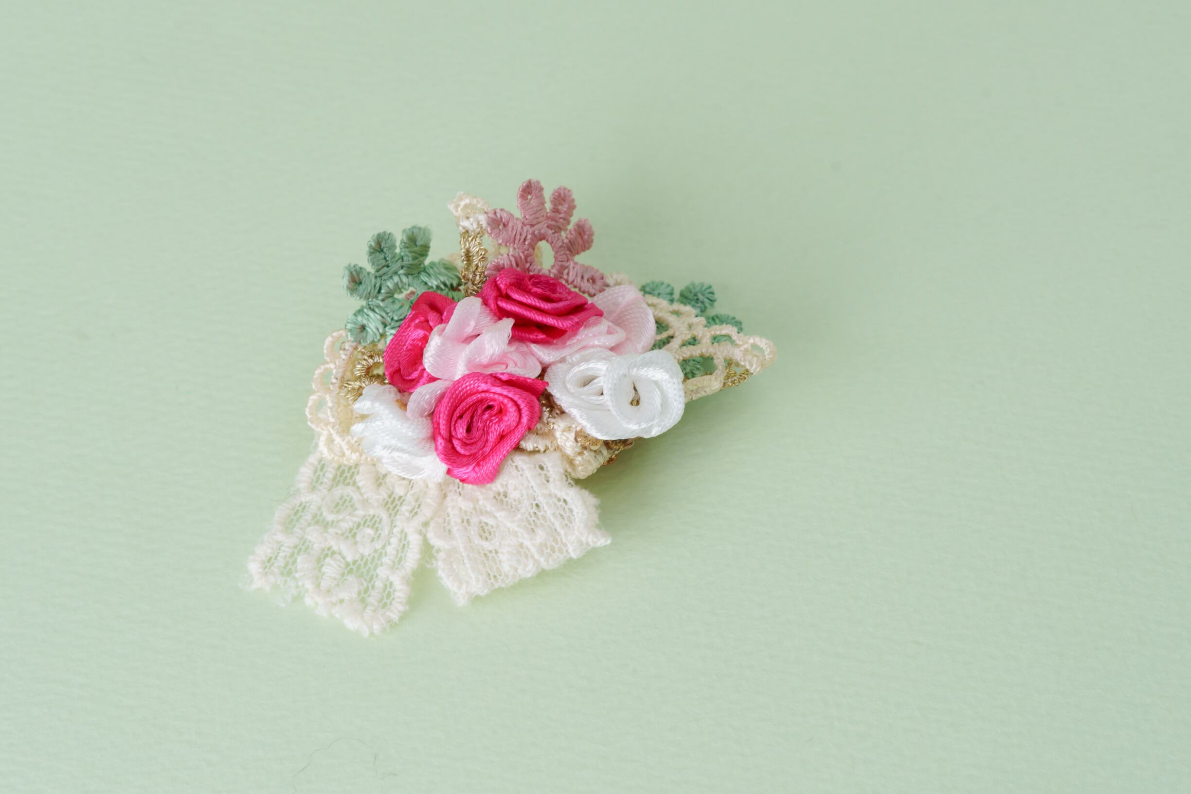 手作りのヘッドアクセサリーはブローチになっているので、着脱で雰囲気を変えてお楽しみください。